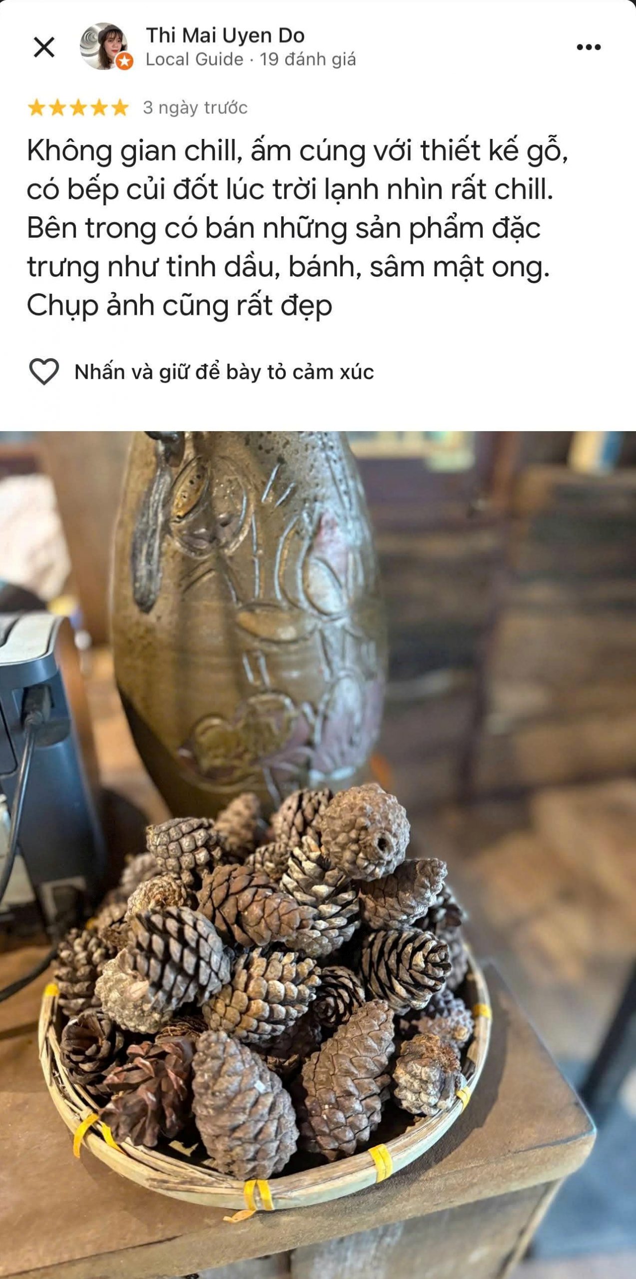 Một khách hàng đã chia sẻ: “Không gian chill, ấm cúng với thiết kế gỗ, có bếp củi đốt lúc trời lạnh nhìn rất chill.” (bình luận từ tài khoản Thi Mai Uyen Do).